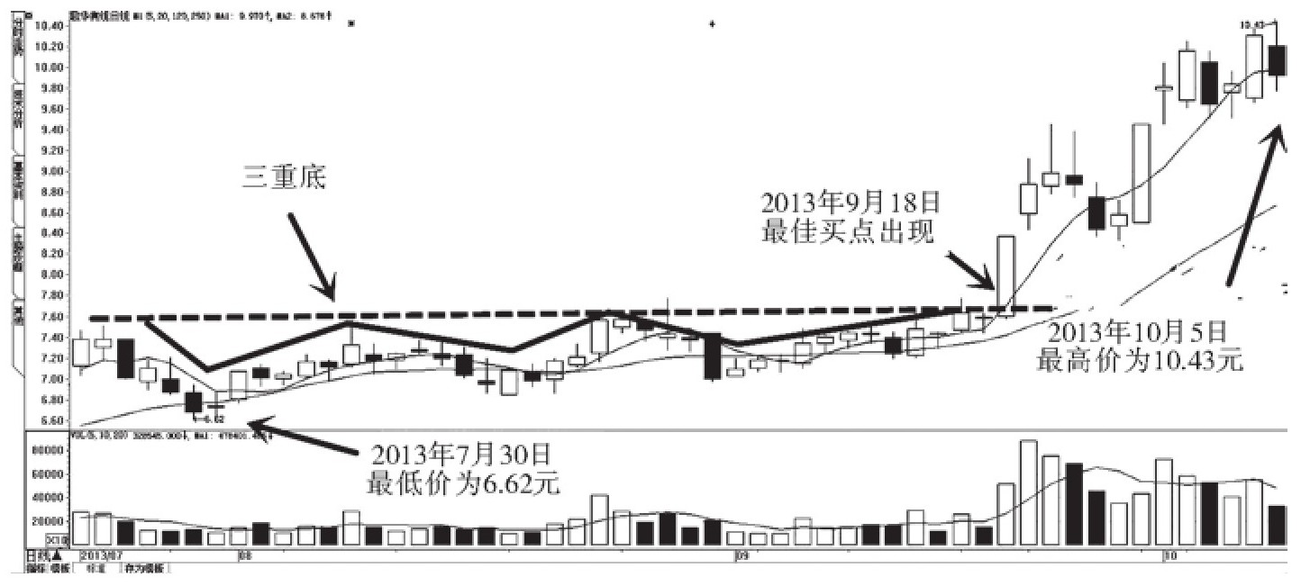 歌华有线(股票代码:600037)在2013年7月至9月期间出现三重底形态,随后股价一路上升。如图5-37所示,2013年7月30日股价最低6.62元,2013年9月18日股价成功突破颈线,出现最佳买点,股价随后一路上升,截至2013年10月5日股价最高10.43元,期间股价涨幅达57.55%。如果投资者能够在9月18日买入该股,相信随后的利润也不会让投资者们失望。
