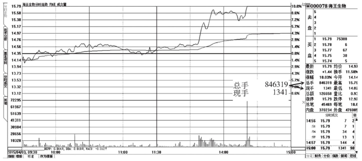 一只股票最近的一笔成交量,叫作现手,单位为手。一个交易日内所有现手加起来就是总手,即这一交易日内的成交量(图6-2)。