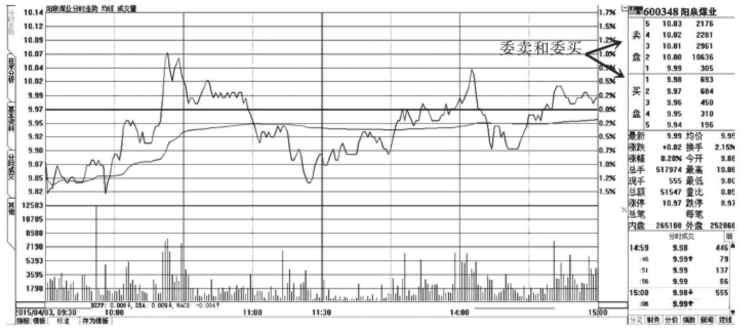 委买是指委托买入股票的价格比卖方给的价格低,而暂时未成交的交易;委卖是指委托卖出的股票价格比买方给的价格高,而暂时未成交的交易(图6-3)。