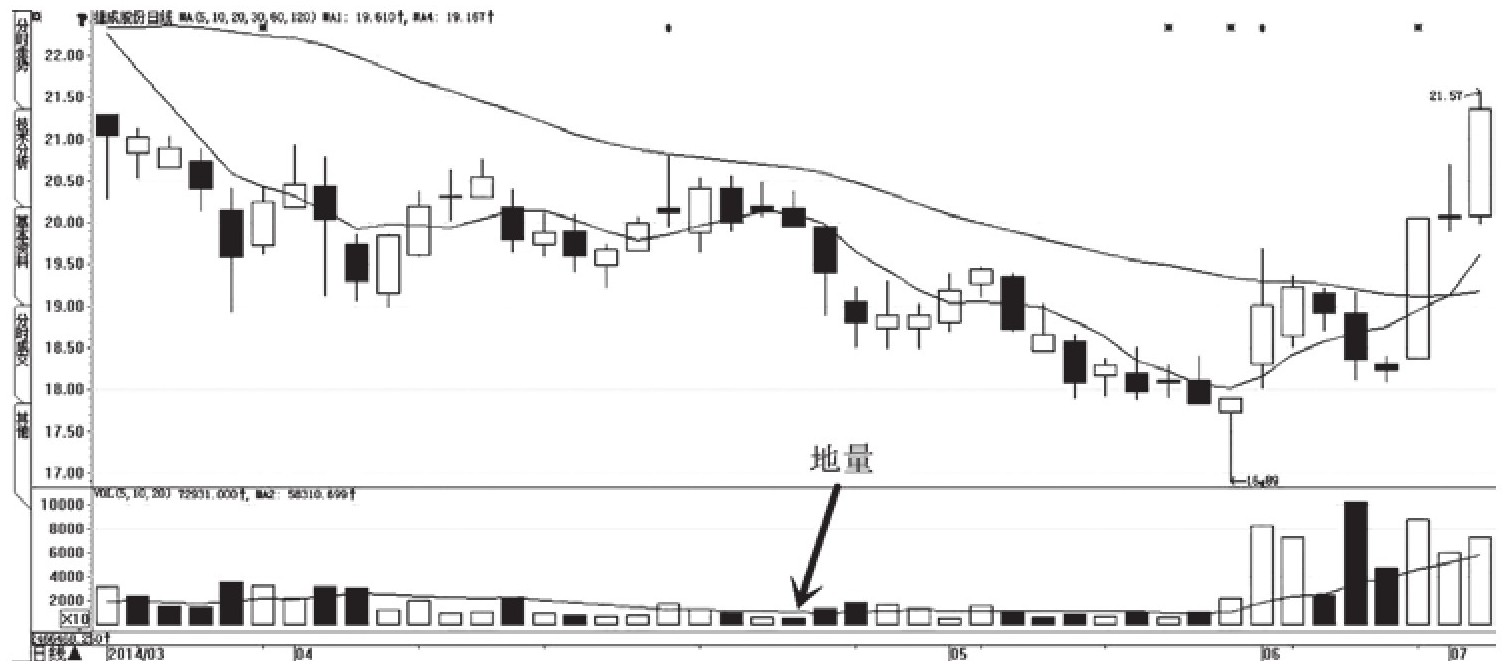 地量指成交量呈现出极度萎缩的状态,与天量相对应。出现地量说明盘中交易非常冷清(图6-7)。