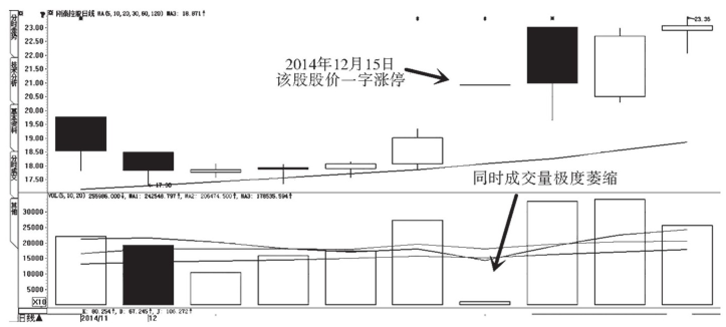 刚泰控股(股票代码:600687,现简称为:*ST刚泰)于2014年12月15日发布利好消息,其全资子公司将以3亿元收购国鼎黄金100%股份。在该利好消息刺激下,刚泰控股股价直接以开盘涨停的姿态出现,并且这种态势一直持续到了收盘,由于众多持股股民不愿放弃这一获利良机,因此导致该股当天的成交量极度萎缩,形成了无量涨停现象(图6-16)。