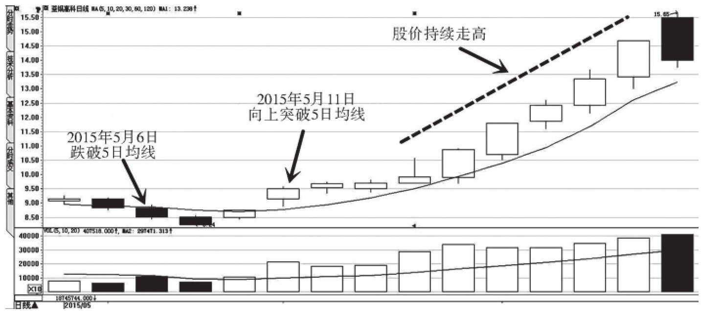 荃银高科(股票代码:300087)股价在经过了一轮下跌行情之后,于2015年5月6日向下跌破5日均线,随后开始在底部徘徊,直到11日该股价再度向上突破5日均线后,股价才开始回暖,随后在5日均线的有力支持下持续走高(图7-1)。