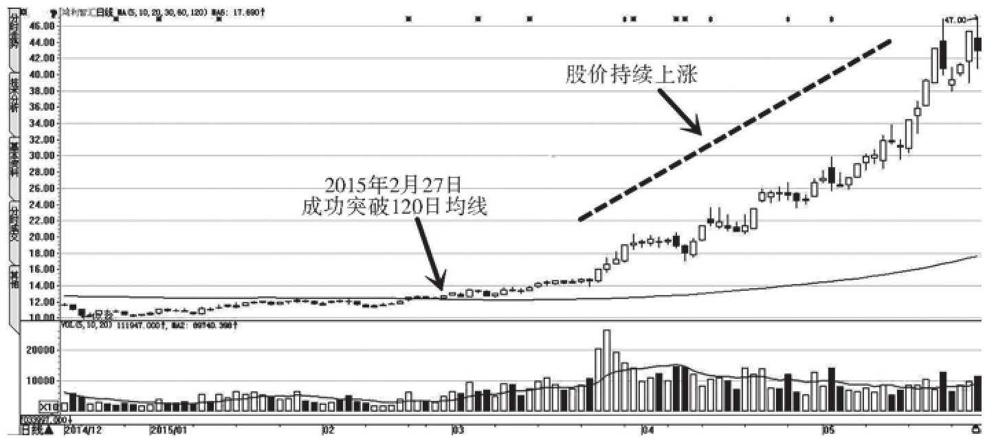 鸿利智汇(股票代码:300219)股价在经过了长时间的底部横向运行后,终于在2015年2月27日成功突破120日均线。由于前期的积累时间比较长,其后市也就具有了持续时间较长的上涨能力。从图7-3中可以看到,该股在突破120日均线后的近3个月的时间里,股价整体走势一直处于不断上涨的态势。如果新股民能够把握这一良机,那么就能获得丰厚的回报。