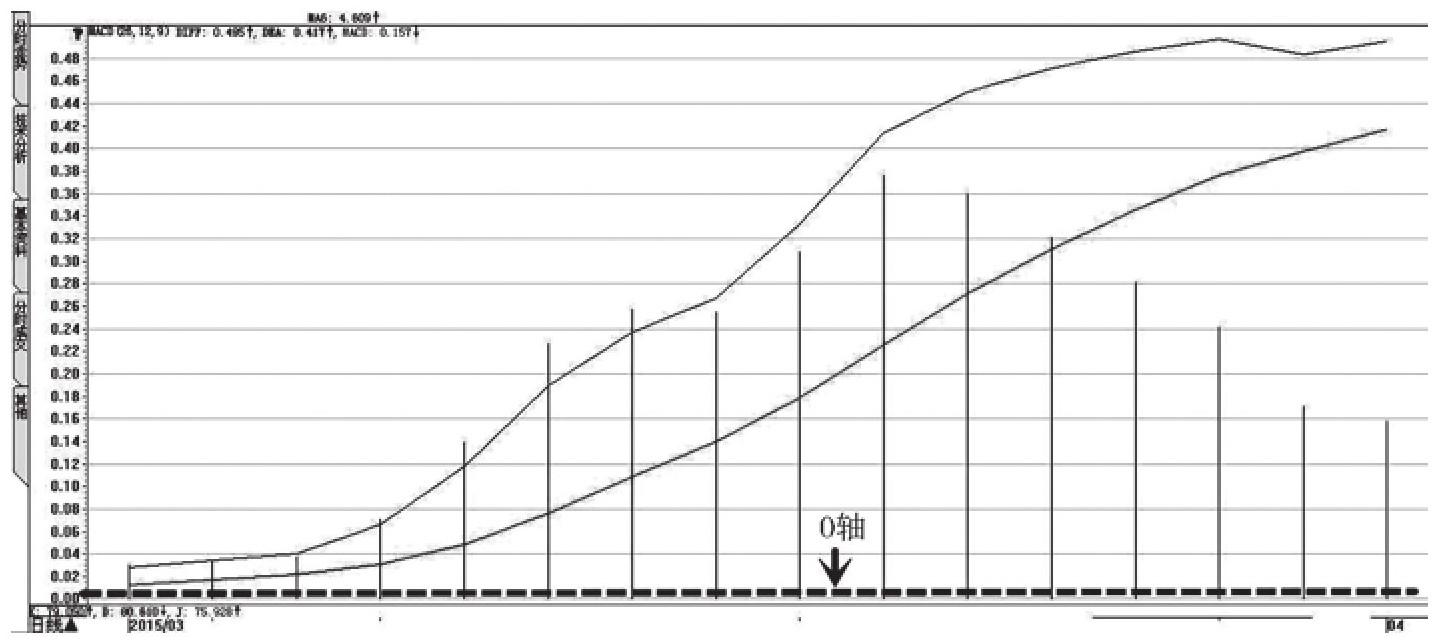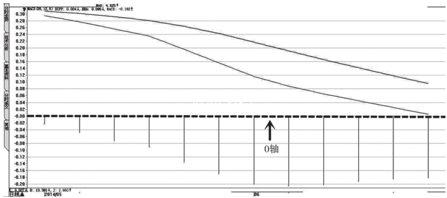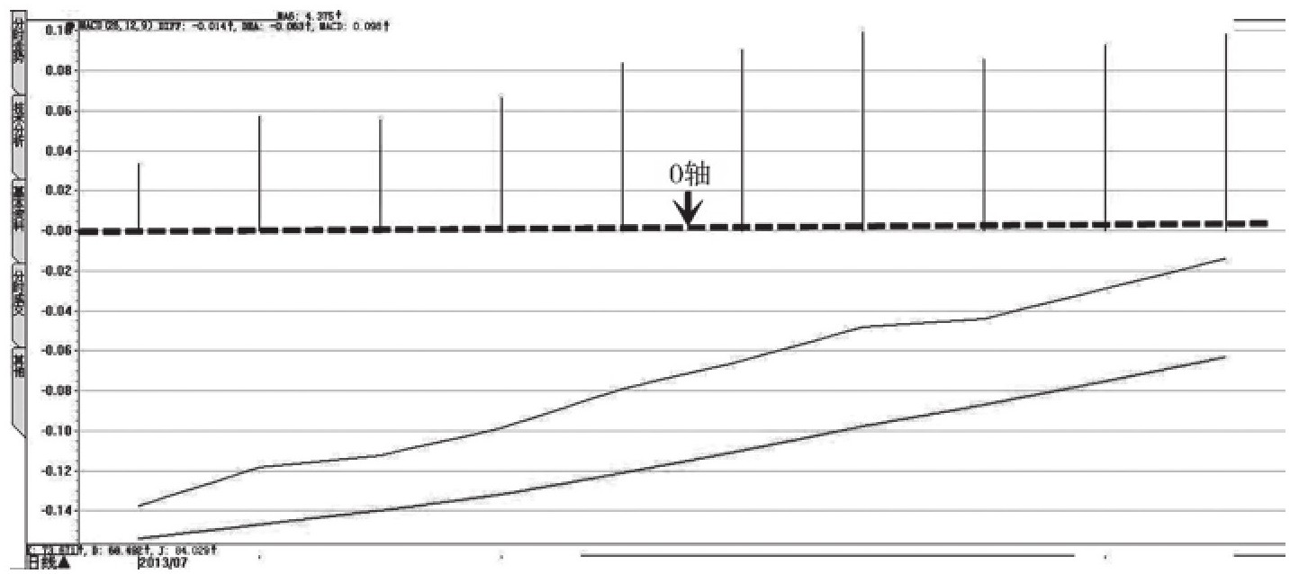 (4)DIFF和DEA指标均位于0轴之下,且同时向上运行。通常代表股价将要走高,可以积极买入(图7-13)。