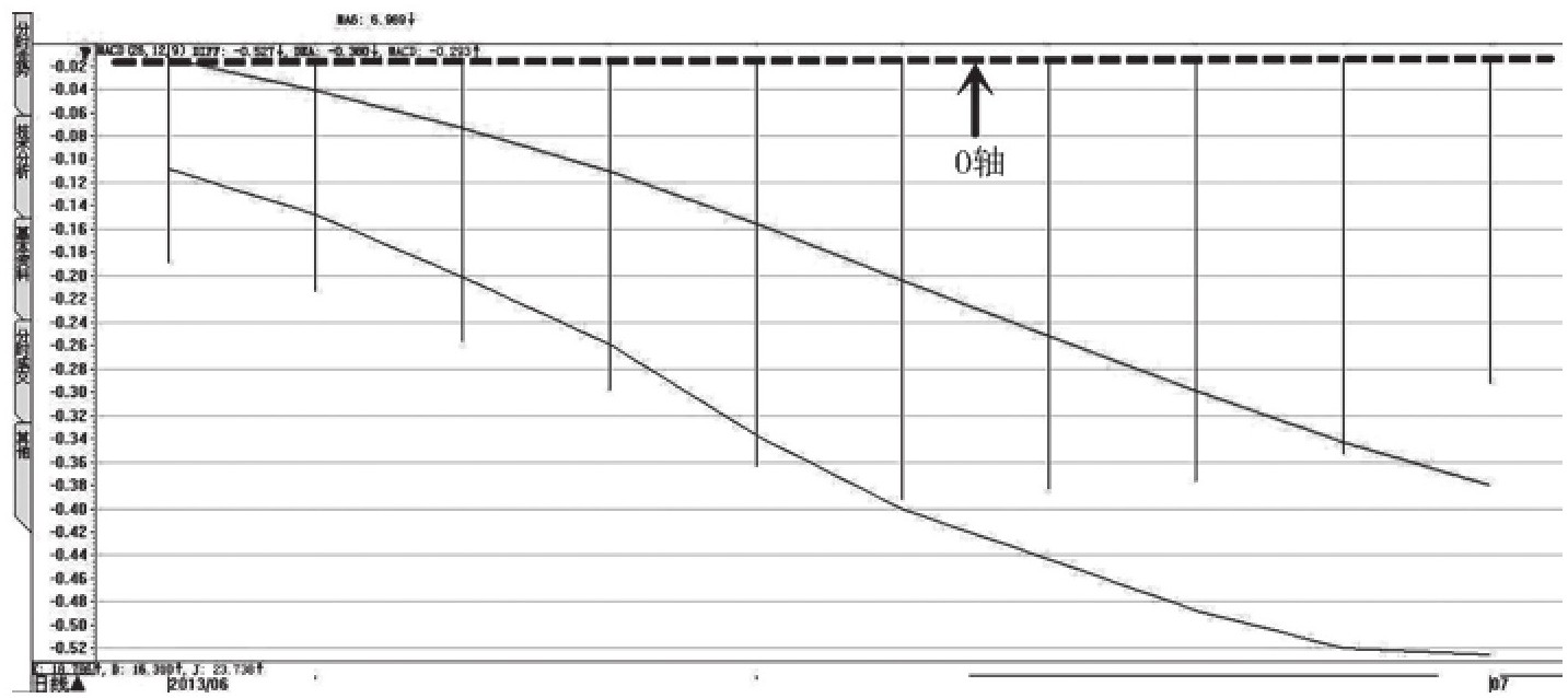(2)DIFF和DEA指标均位于0轴之下,且向下运行。通常代表股市处于空头行情中,可以选择卖出(图7-11)。