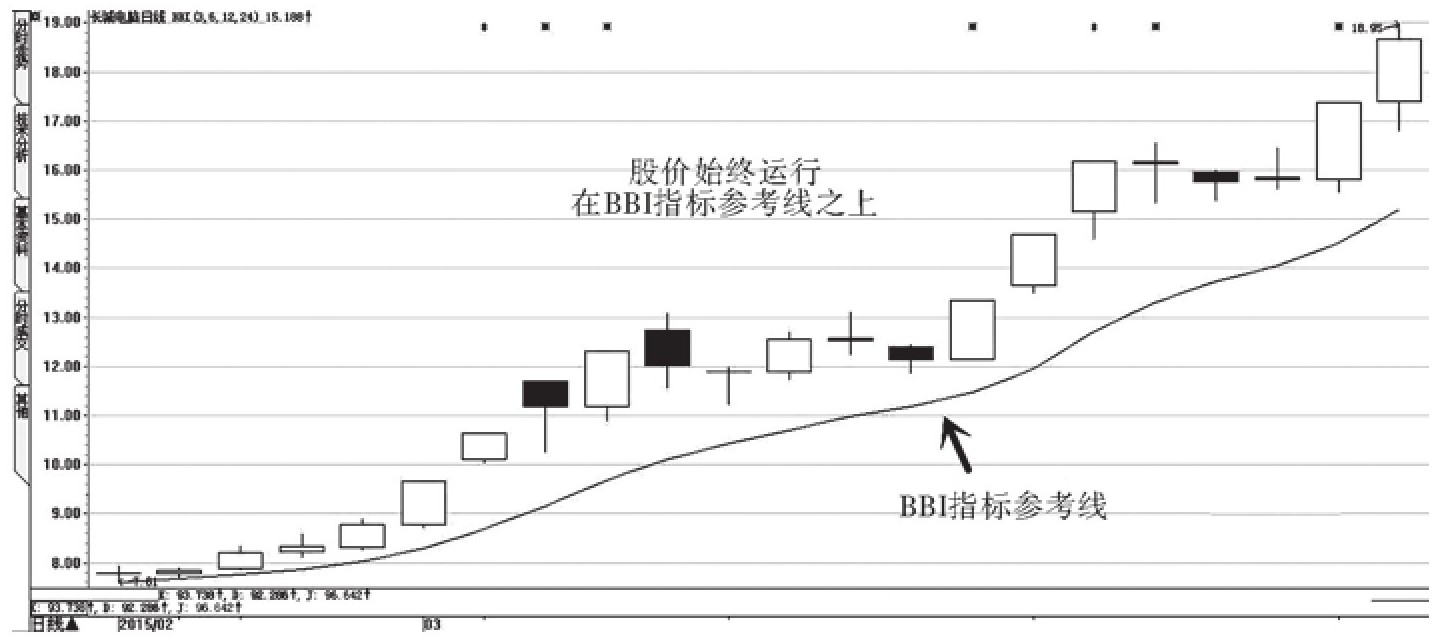 BBI指标是利用股票价格和它自身的参考线进行对比,股价站在BBI指标线的上方时,说明这只股票正处于多头市场中。