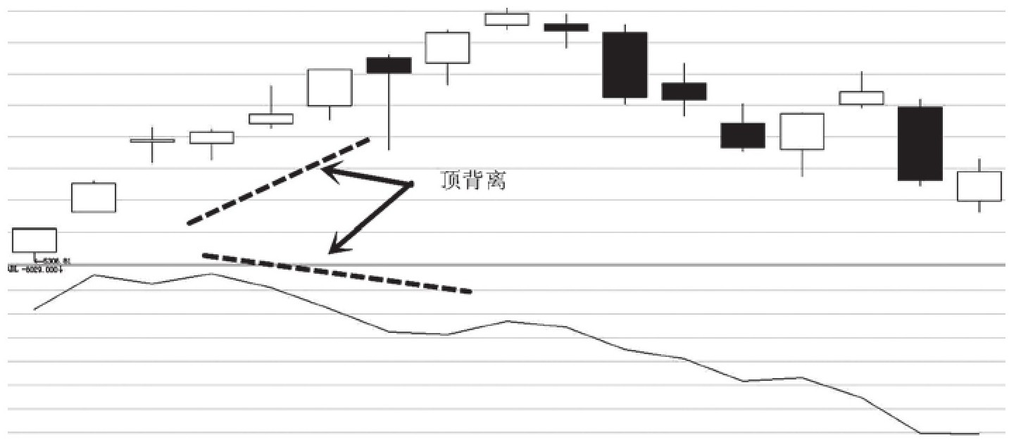 在多头市场里,主力为了维持市场的上升趋势,拉高股价便于自己出货,会操控指标股的股价保持上涨状态,从而影响股指的走向趋势。股指上涨初期,股价大势指数快速上升。经过一段时间的上涨后,当股市大势趋势仍在缓慢地上涨,形成一峰比一峰好的态势时,ADL指标却出现顶部横向移动甚至出现一底比一底低的背离情况,这就是所谓的顶背离。顶背离通常意味着上升趋势即将进入尾声,后市出现下跌行情的概率很大(图7-33)。