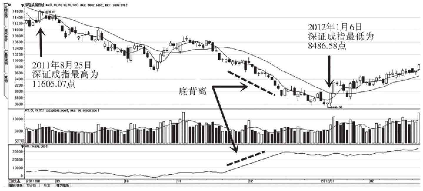 2011年8月至2012年1月期间,深证成指指数始终处于下跌趋势。2011年8月25日深证成指最高点数是11605.07点,而到了2012年1月6日,深证成指最低点数已经下降至8486.58点。在这段时间里,虽然股指在不断下跌,但是其ADL指标却始终保持上涨趋势,两者形成了底背离现象。随后没多久,深证成指便开始止跌回升(图7-35)。