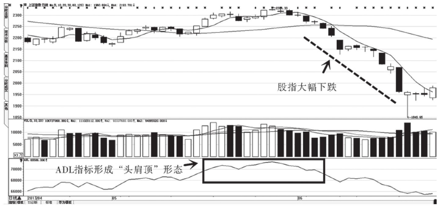 2013年5月中旬至6月,上证指数持续在高位横向波动,此时其ADL指标却逐渐构筑出了“头肩顶”这种见顶形态。当ADL指标彻底形成“头肩顶”形态后,股指便开始大幅下跌,受其影响,股市中的大部分个股也进入一个下跌通道中。如果股民朋友没有及时卖出手中的持股,就很可能会受到影响,给自己带来损失(图7-36)。