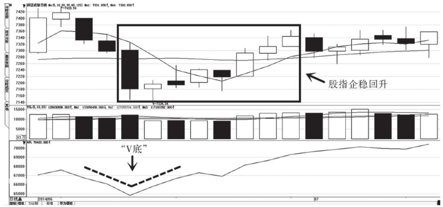 2014年6月初至中旬这段时间里,深证成指的ADL指标形成了“V底”形态,在该形态的推动下,股指也停止了下跌趋势,在底部企稳回升。如果股民此时能够择机买进股票,就有很大的可能获得丰厚的回报(图7-37)。