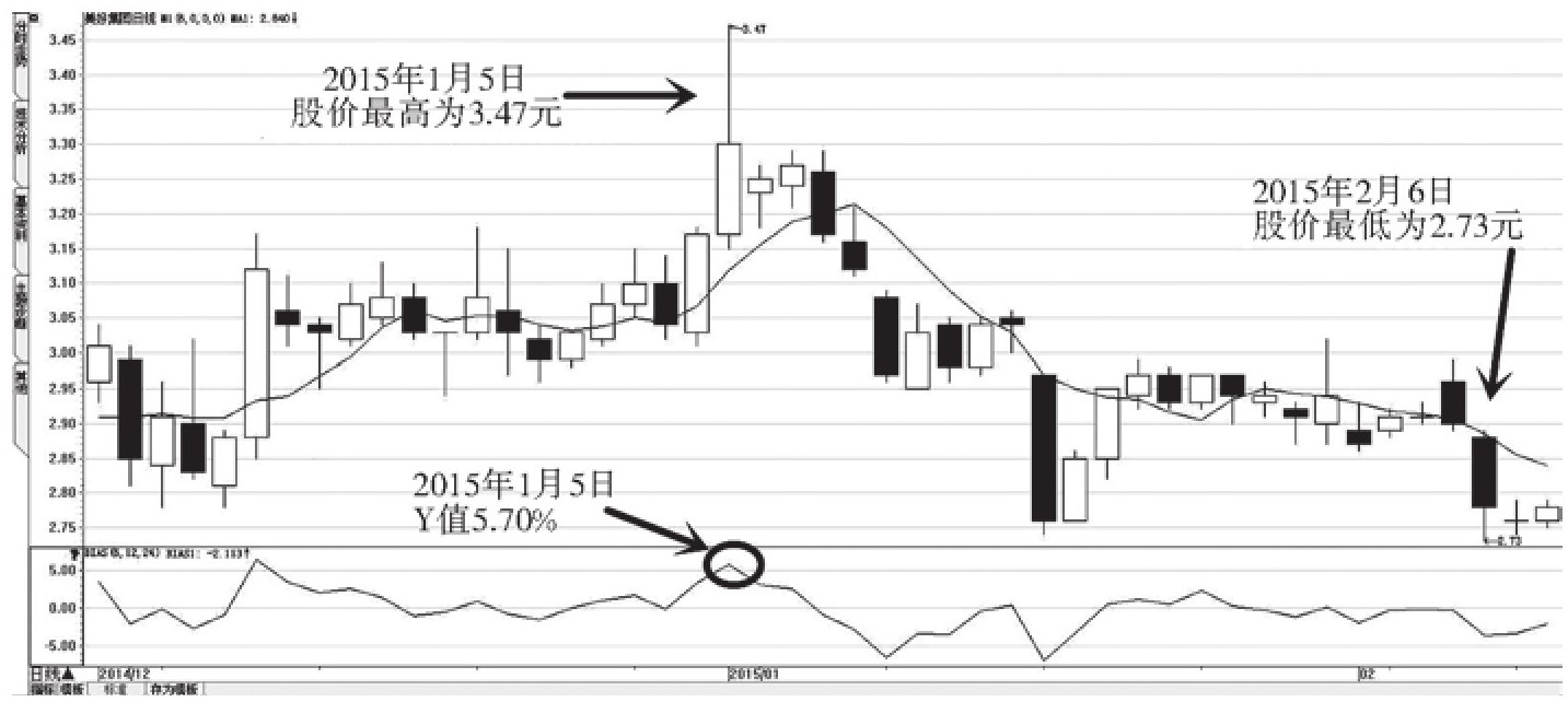 美好置业3(股票代码:000667)在2015年1月5日股价最高为3.47元,6日当日BIAS指标达到5.70%,出现超卖现象,随后股价一直下跌,截至2月6日股价最低为2.73元(图7-45)。