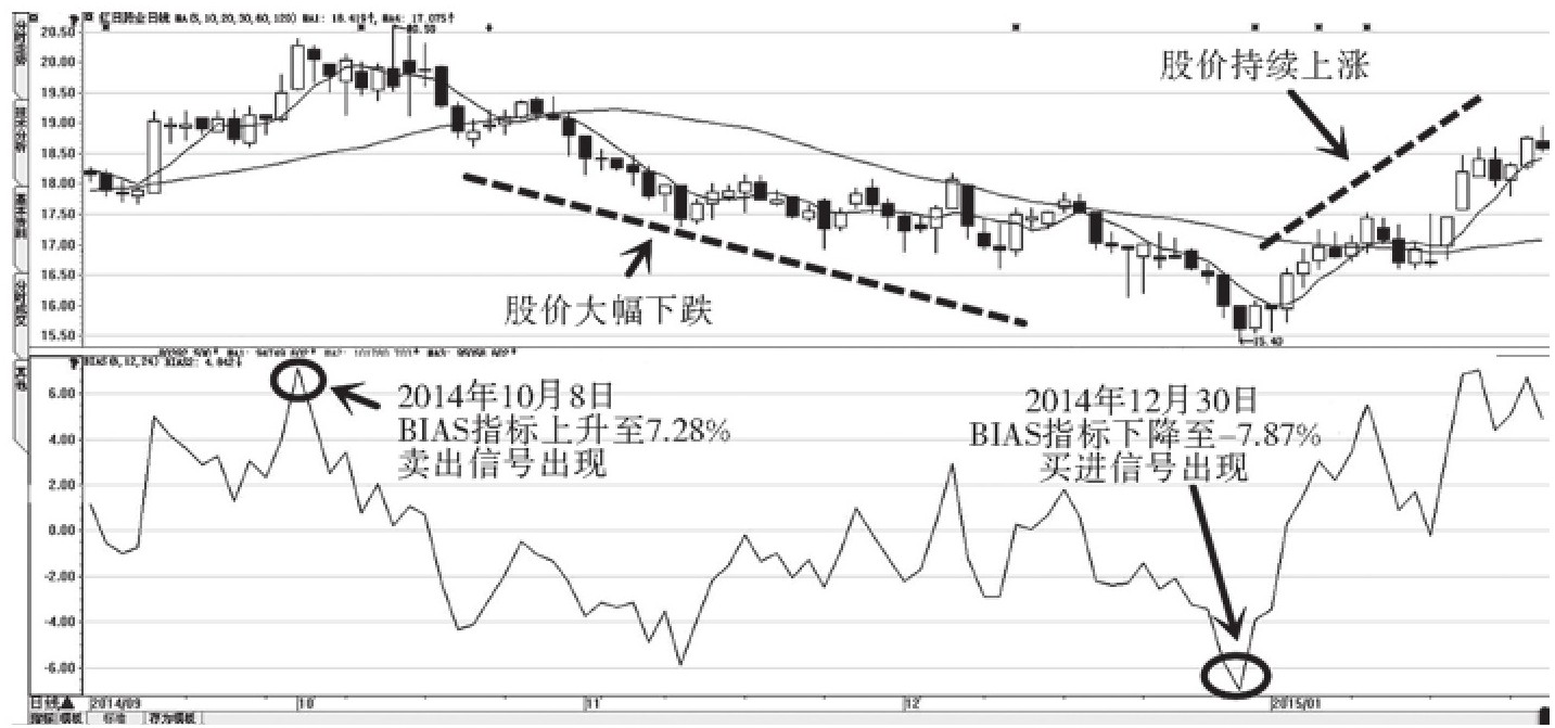 2014年10月8日,红日药业(股票代码:300026)的BIAS指标上升至7.28%,对于股民朋友来说,这是一个十分明显的卖出信号,从其K线走势图上可以看到,在该股BIAS指标达到7.28%后,股价便开始大幅下跌。如果股民朋友能够按照BIAS的指示操作,就能合理规避这一次下跌行情。同样地,如果股民能在2014年12月30日BIAS指标下降至-7.87%时,执行买进操作,就能吃到一段不小的上涨行情(图7-46)。