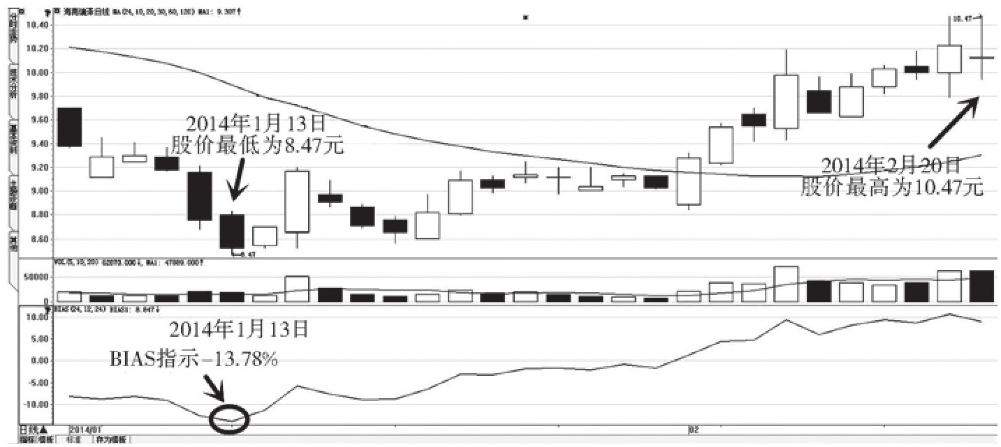 海南瑞泽(股票代码:002596)在2014年1月13日股价最低8.47元,在24日乖离率平均线中当日BIAS指标达到-13.78%,出现超卖现象,随后股价走高,截至2月20日股价最高为10.47元(图7-47)。