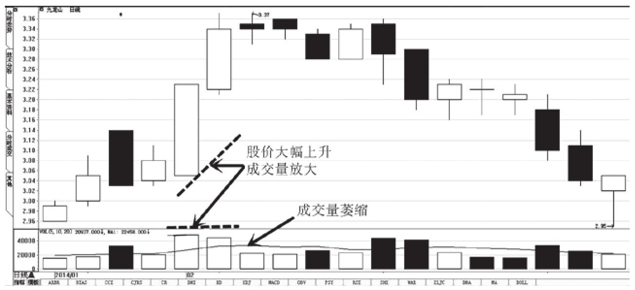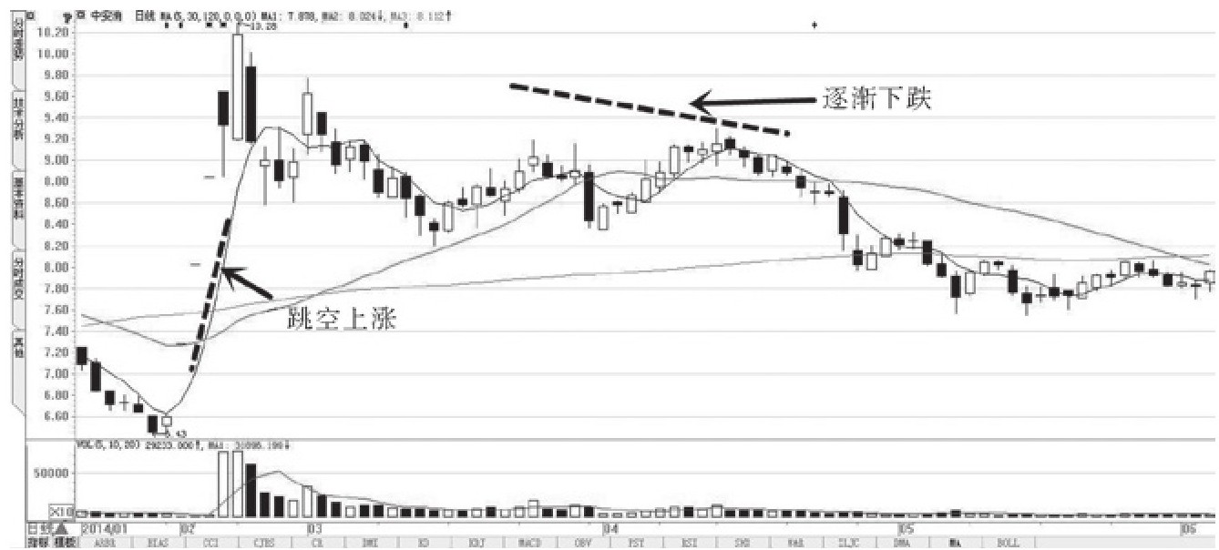 中安消5(股票代码:600654)其股价自2014年1月13日起,开始了它的跳空式上涨旅程,截至2月24日涨幅已经达到59.87%。涨幅虽然不是特别大,但是这种没有任何道理的跳空让人看得目瞪口呆。主力藏在其中,在暴涨后开始出货,其股价开始下跌,虽然盘中小规模抵抗不断,但在大势的驱使下,其下跌已成了不可避免的定局(图8-2)。
