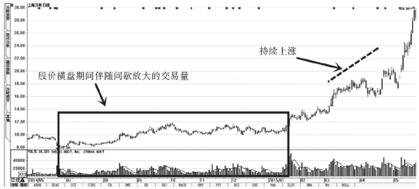 上海贝岭(股票代码:600171)股价在2014年6月~2015年1月都是在底部游荡,虽然该股股价没有大幅波动,但是其成交量却在间歇放大。这一现象就透露出了主力在悄悄吸筹的动作,而且主力把自己隐藏得非常好。直到2015年1月21日以后,主力开始在众多投资者面前展示其雄壮的肌肉,强力推动股价,该股股价也在随后的4个月内上涨了165.54%(图8-5)。