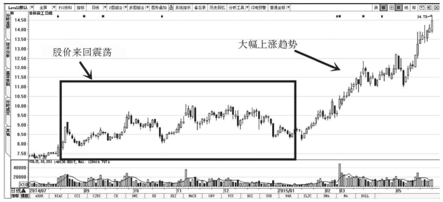 吉林森工(股票代码:600189)股价在2014年1月~2015年1月之间因主力使用震荡式建仓吸筹的方式,在一定区域内不断波动,在投资者不明所以的时候,骤然发力,使股价快速接近主力的预期。这种迷惑性很强的方式使得震荡式建仓吸筹的方式具有很强的实用性(图8-6)。