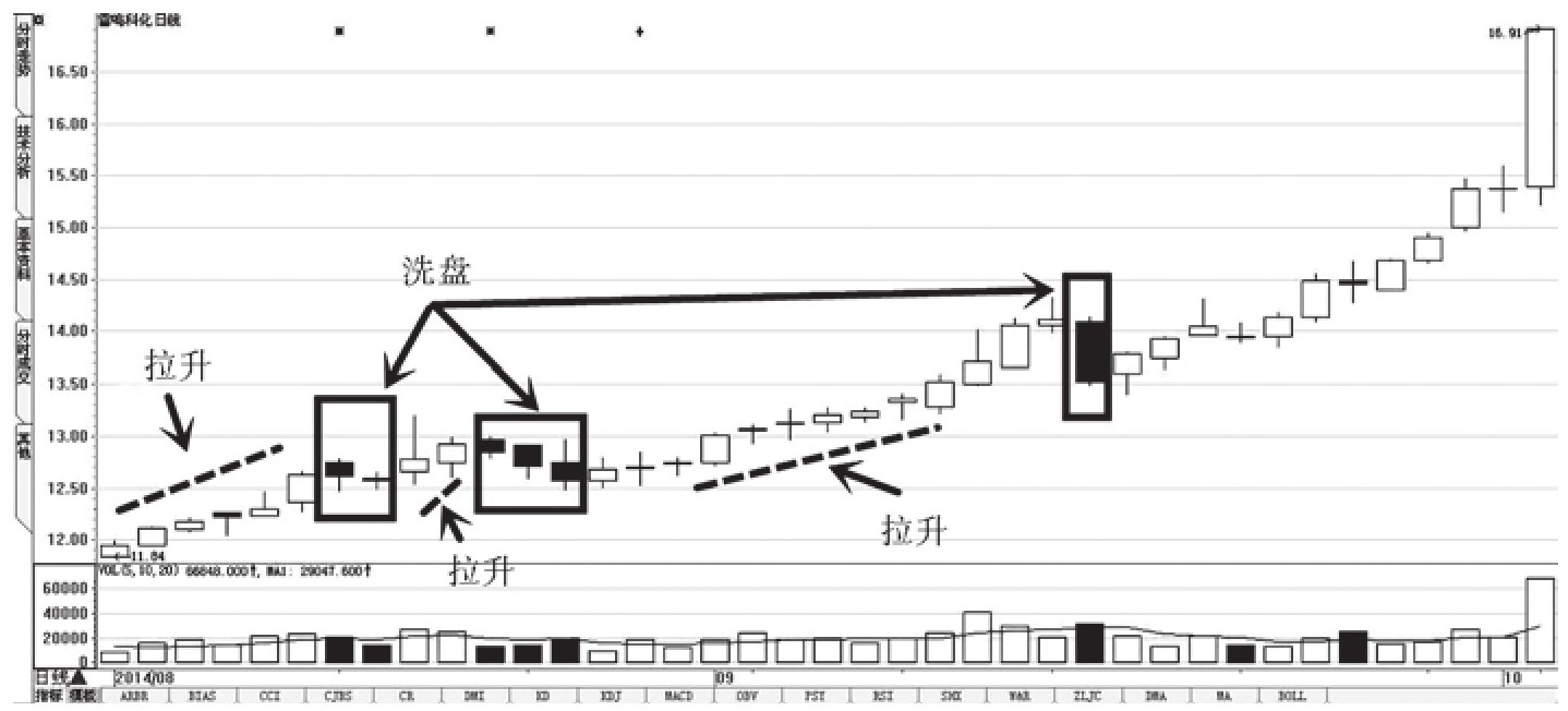 雷鸣科化6(股票代码:600985)股票价格在2014年8月~10月期间,被主力拉升一定的幅度后,就会出现一根或者几根阴线,造成下跌现象。主力多次使用相同的手段,不断营造股价见顶的假象,将不稳定的跟风盘不断洗刷出。这就是一种比较典型的边拉升边洗盘的洗盘手段(图8-10)。