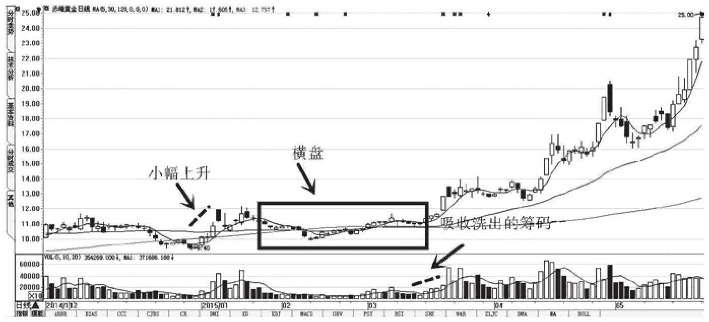 赤峰黄金(股票代码:600988)其股价在2014年12月~2015年5月期间,被主力操控洗盘。其手法就是通过短期的小幅度股价攀升,使一些跟风盘进入,再通过将近两个月的横盘“折磨”,使跟风盘抛出自己的筹码,力图在不损失筹码的同时能够再次吸入一部分筹码壮大自己。如果该股的投资者能把持住自己,获利的良机就会在不久之后到来(图8-11)。