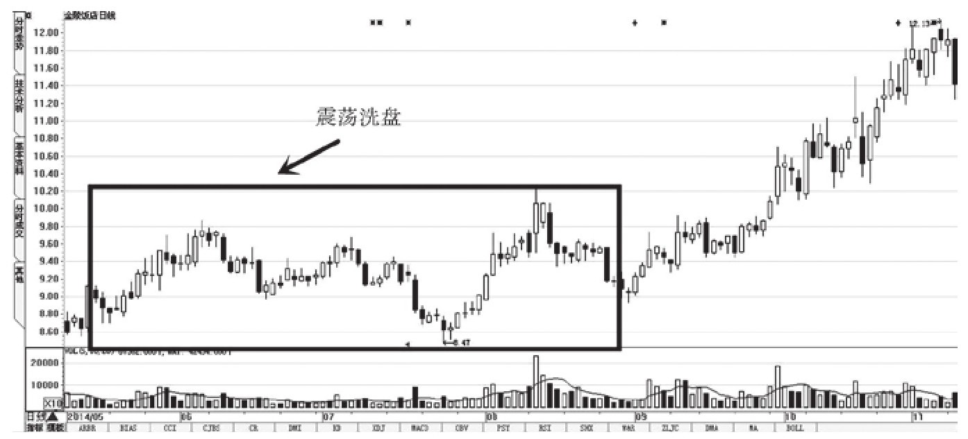 金陵饭店(股票代码:601007)其股价在2014年5月~11月,呈现毫无规律的波动,时而走高,时而跌入低谷。这种将近半年的波动,一般都是些实力雄厚操作老道的主力操控的,根本目的就是让这一时间段内的跟风盘摸不到头脑,不敢进入或者直接抛出手中的筹码(图8-12)。