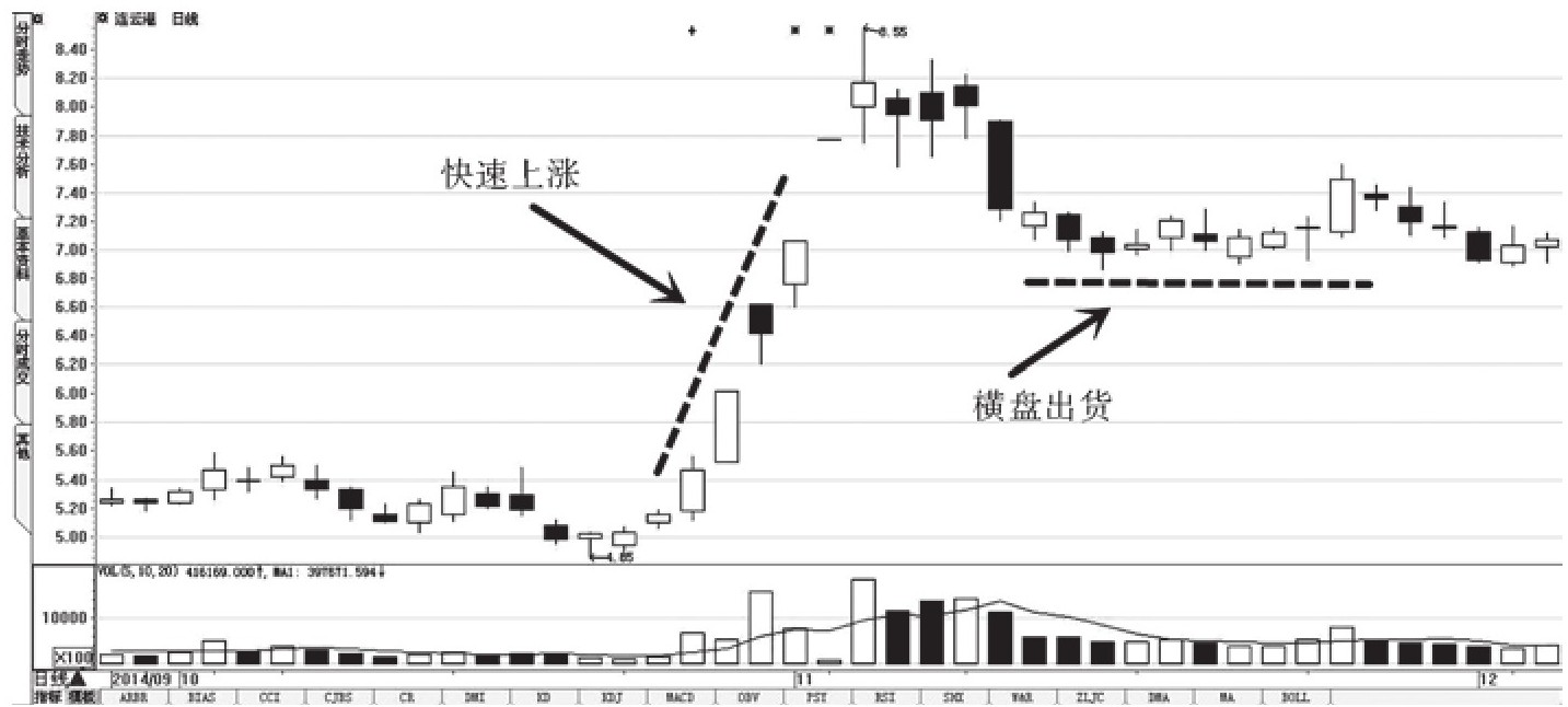 连云港(股票代码:601008),股票价格在2014年10月~12月期间,被主力操纵。主力在一段时间的积累后,开始大幅拉升股价,甚至是使股价涨停封板。当股价达到其预定的目标位时,开始进行横盘整理。此时大多数投资者认为这只股票是在积蓄力量,从而纷纷买进该股,其实这时主力正将手中的筹码抛出,至于后期如何操作还要看主力的心情(图8-13)。