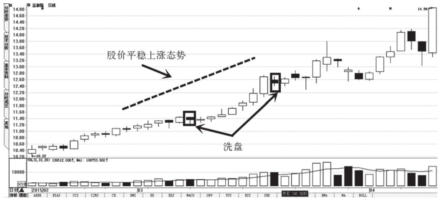 介入宝泰隆(股票代码:601011)股票的主力就是采用了典型斜线式的拉升方式。该股股价在拉升的过程中没有大幅波动,却随着洗盘的动作,但整体不会影响股价的平稳上升势态,没有雄厚的实力是做不到这一点的。在此过程中,该股股价的涨幅达45.20%(图8-14)。