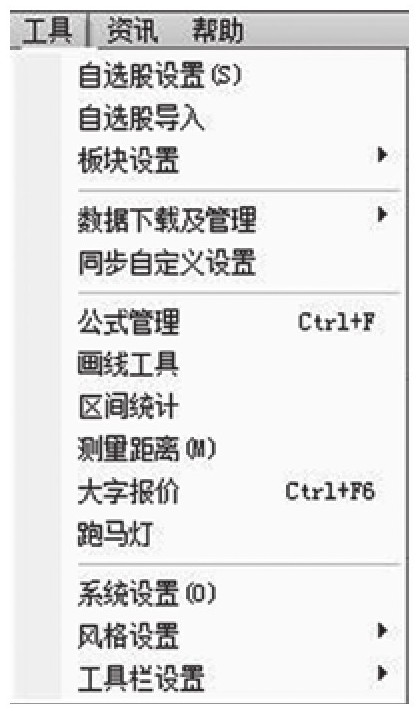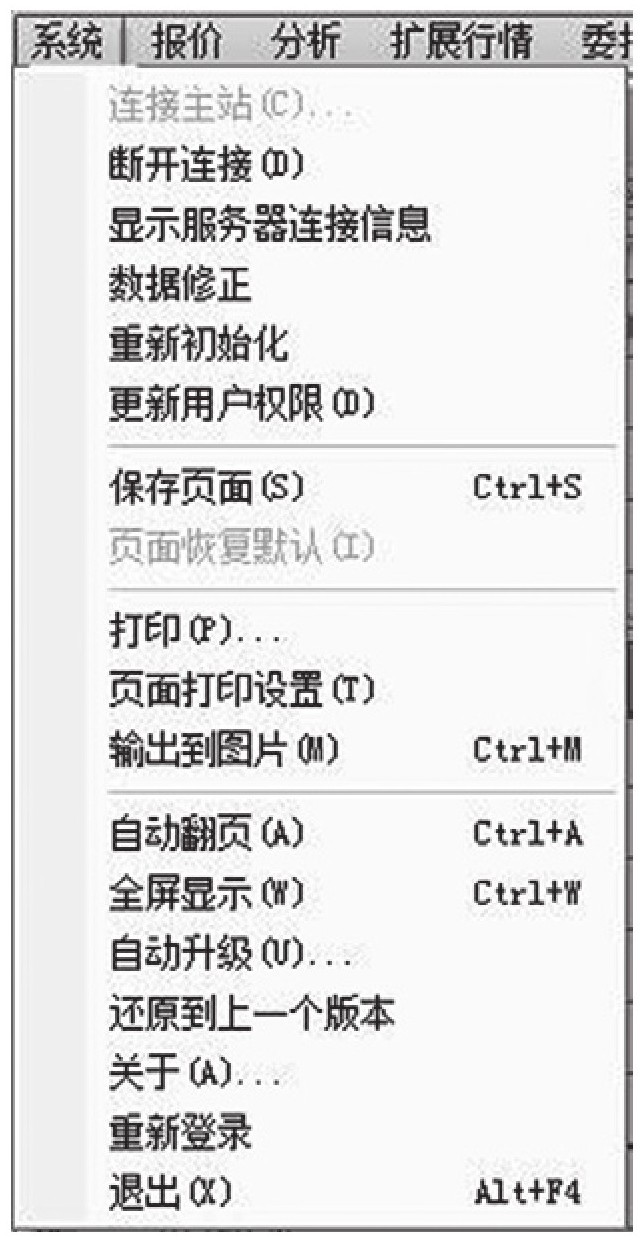 “同花顺”的主菜单栏可以分为系统、报价、分析、扩展行情、委托、智能、工具、资讯和帮助等选项。