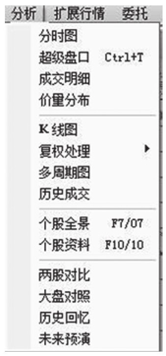 分析选项下拉菜单有成交明细、K线图、复权处理、多周期图等,可以根据不同的选项查看不同的分析结果(图9-4)。
