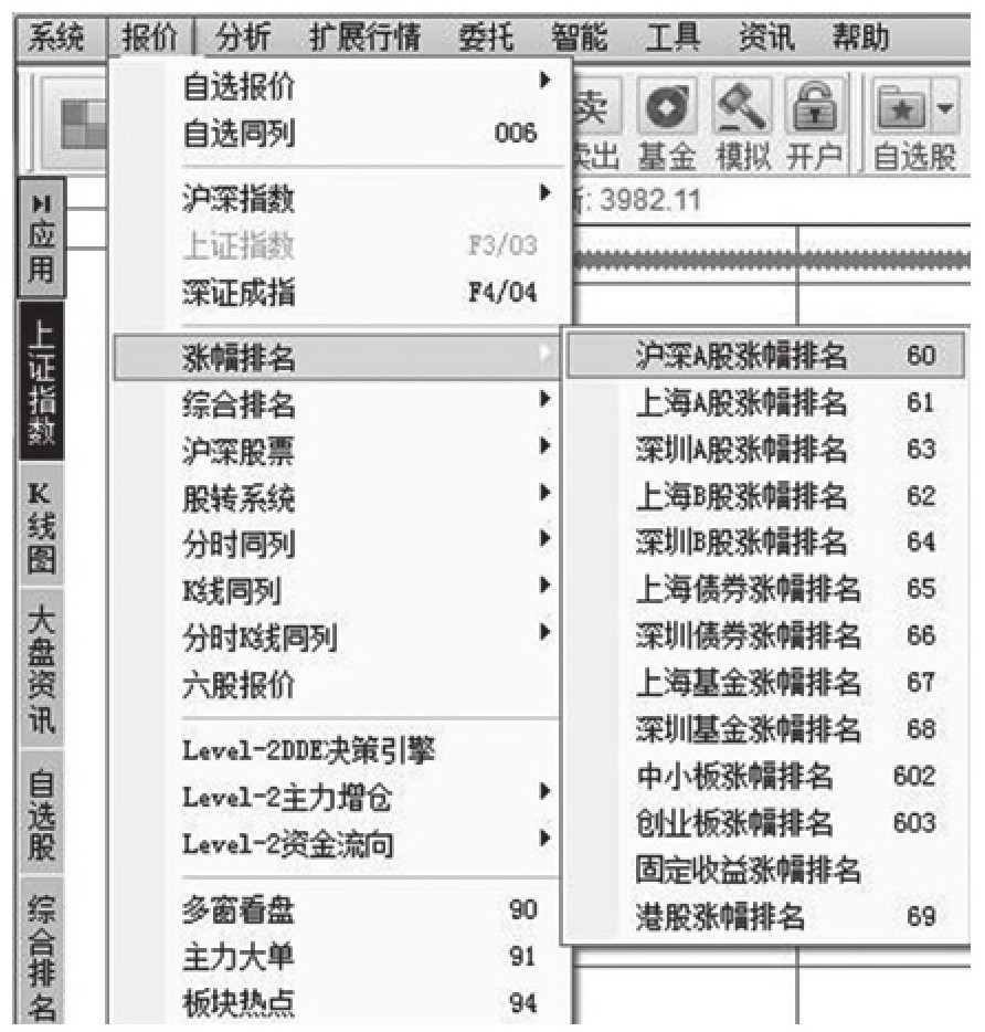 “同花顺”的报价选项主要可以分为沪深指数、涨幅排名、综合排名、K线同列等。在其下拉菜单的选项中,后面的数字代表快捷键操作。例如,选择涨幅排名中的沪深A股涨幅排名,可以直接键入60进入界面(图9-3)。