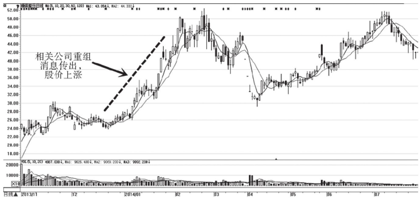 2013年11月,顺荣股份8(股票代码:002555)传出重组的消息。此后,股价开始上涨,当2014年3月重组消息确认后,股价涨势停止,期间涨幅达65.9%。如果股民能够抓住时机将手中弱势股更换为该股,那么就有可能扭亏为盈(图10-1)。