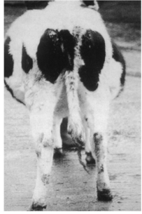 急性瘤胃臌气,常在采食不久发病,病畜腹部迅速膨大,左肷窝明显突起,严重者高过背中线(图1.1)。腹壁紧张而有弹性,叩诊呈鼓音;瘤胃蠕动音初期增强,常伴发金属音,后减弱或消失。病畜表现不安,回顾腹部,发出吭声。反刍和嗳气停止,食欲废绝,呼吸急促甚至头颈伸展,张口呼吸,呼吸数增至60次/min以上;脉搏增数,可达100次/min以上,心悸。病的后期,心力衰竭,血液循环障碍,静脉怒张,呼吸困难,黏膜发绀;站立不稳,步态蹒跚甚至突然倒地,痉挛、抽搐,因窒息和心脏麻痹而死亡。