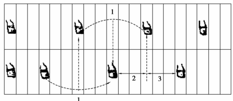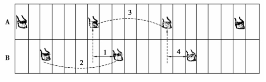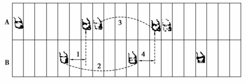 正常家畜运动时,一肢的支柱作用(支柱期)与对侧另一肢的悬垂作用(悬垂期),是同时起同时止。所谓家畜的步幅,就是悬垂肢从第1次着地的蹄迹到第2次着地的蹄迹之间的距离,称为一步,也称为一步幅。在行进同时,此一步幅以被对侧支柱肢的蹄迹分为两个半步(或两个步段),在对侧支肢蹄迹前方的叫前半步,在对侧支柱肢蹄迹后方的叫后半步。前后两个半步的距离,健康家畜是基本相等的(图10.1)。