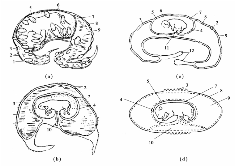 1—胎儿胎盘;2—尿膜绒毛膜;3—绒毛膜;4—尿膜羊膜;5—羊膜;6—羊膜绒毛膜7—羊膜囊;8—尿膜;9—尿膜囊;10—卵黄囊;11—脐带;12—坏死端