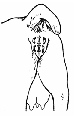 (5)固定。整复后,采用阴门缝合固定。可用粗缝线给阴门作2、3针间断褥缝合、圆枕缝合、纽扣缝合、双内翻缝合或袋口缝合。以双内翻缝合为例(图12.5),在阴门右侧3 cm的皮厚处下针,从同侧阴门边缘旁穿出;左侧同样将线穿好,然后在此线之下2 cm处再将线穿好,与原线头打活结(以便突然临产时拆线)。两侧露在皮肤外的线上须套一段橡皮管,在努责强烈时,线不至将皮肤勒破。缝合不可过紧。不可缝合阴门下角,以免妨碍排尿。缝合后定期消毒,以防感染。临产前或者等母畜确实不再努责之后拆线。