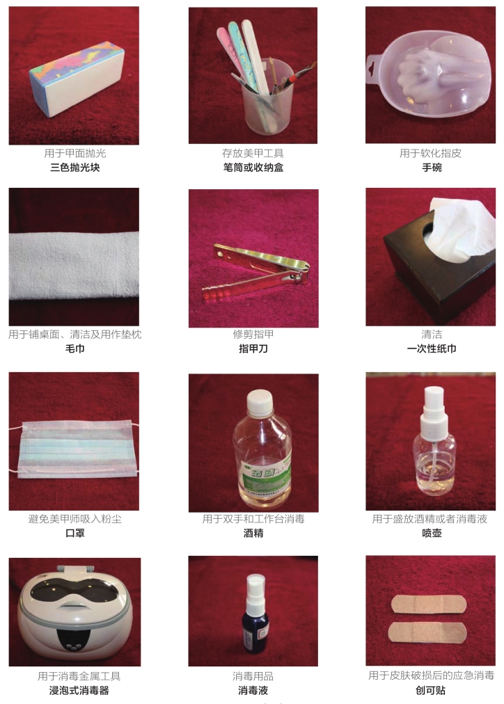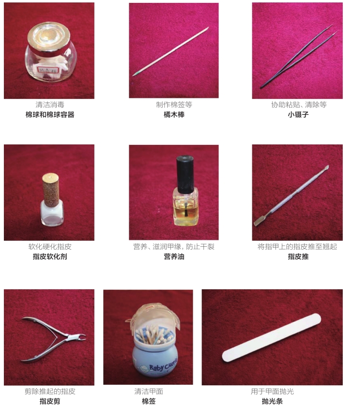 美甲工作使用的工具不大,但是比较多。由于基础手部护理是所有服务项目的前提和基础,因此下列工具和用品(见图1-1-3)也是所有服务项目所必需的。为了方便学习,将其统称为基础工具。