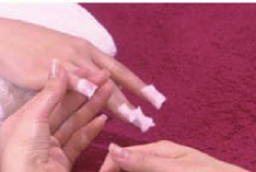将大小适当的棉球(片)浸透洗甲水依次按贴在指甲表面。