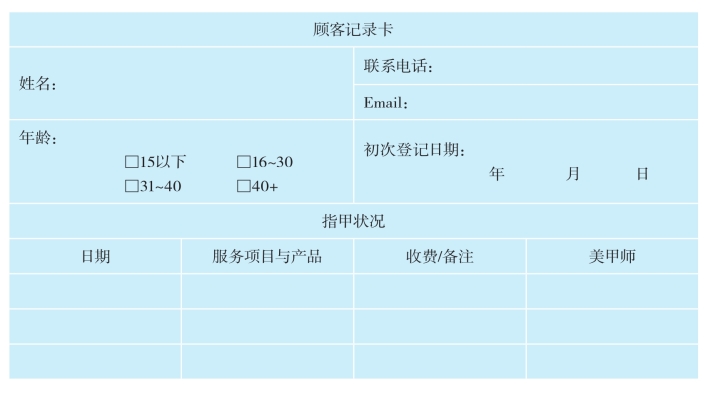 顾客资料一般为美甲师提供顾客先前造访的详细背景资料,是美甲师规划适合的程序的依据。顾客资料由电脑录入或手写完成,无论什么形式,都要包含以下信息: