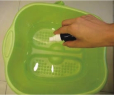在足浴盆内注入1/2温水,放入适量抗菌液。