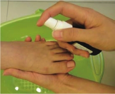 用75%的酒精给自己的双手和顾客的双足消毒。
