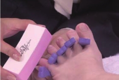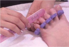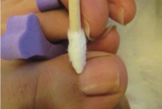 用棉签蘸取酒精去除足趾上多余的油渍。
