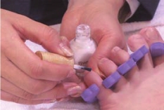 将指皮软化剂涂抹在趾甲后缘,并停留2~3分钟。