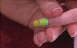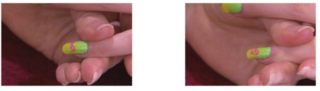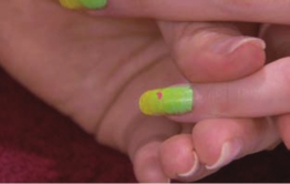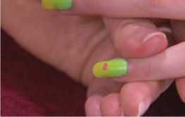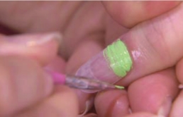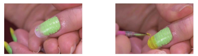 用彩绘笔蘸取绿色颜料,从指甲后缘向前缘在指甲贴片上横向涂抹,制造粗糙的纹理效果。用彩绘笔蘸取黄色颜料,从指甲前缘向后缘在指甲贴片上横向涂抹,并与绿色颜料衔接。