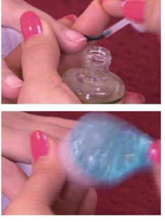 用棉片蘸取清洁剂清洗指甲表面,去除甲面浮胶。