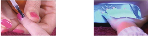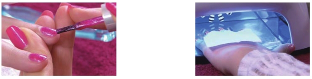 在甲面上薄薄地涂抹一层底胶,放入凝胶灯内照射30秒。