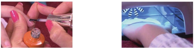 在底胶上薄薄地涂抹一层甲油胶,放入凝胶灯内照射30秒。