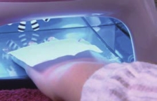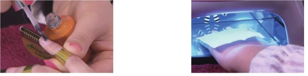 在底胶上薄薄地涂抹一层彩色光效胶,放入凝胶灯内照射120秒。
