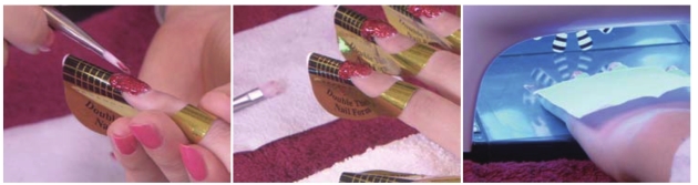 注意:因为手指上有油脂和水分,这些都是引起指甲起翘的直接原因,所以在操作过程中,经过除尘和涂抹过黏合剂的甲面一定不要用手指触碰。