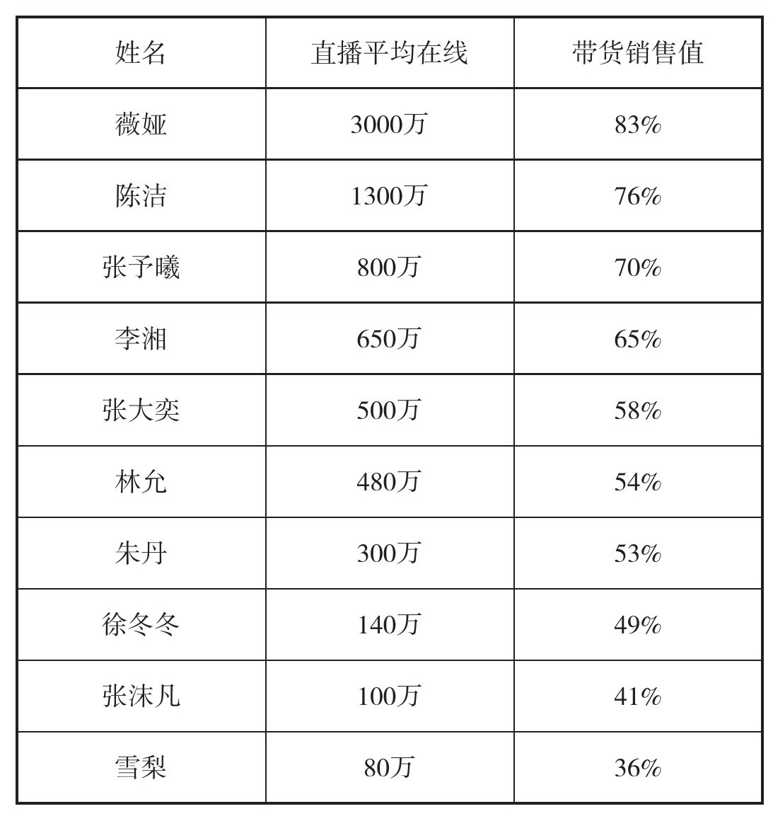 在“2020年最新季度带货女王TOP10”名单中,李湘以不俗的成绩排名第四,如表1-2所示。