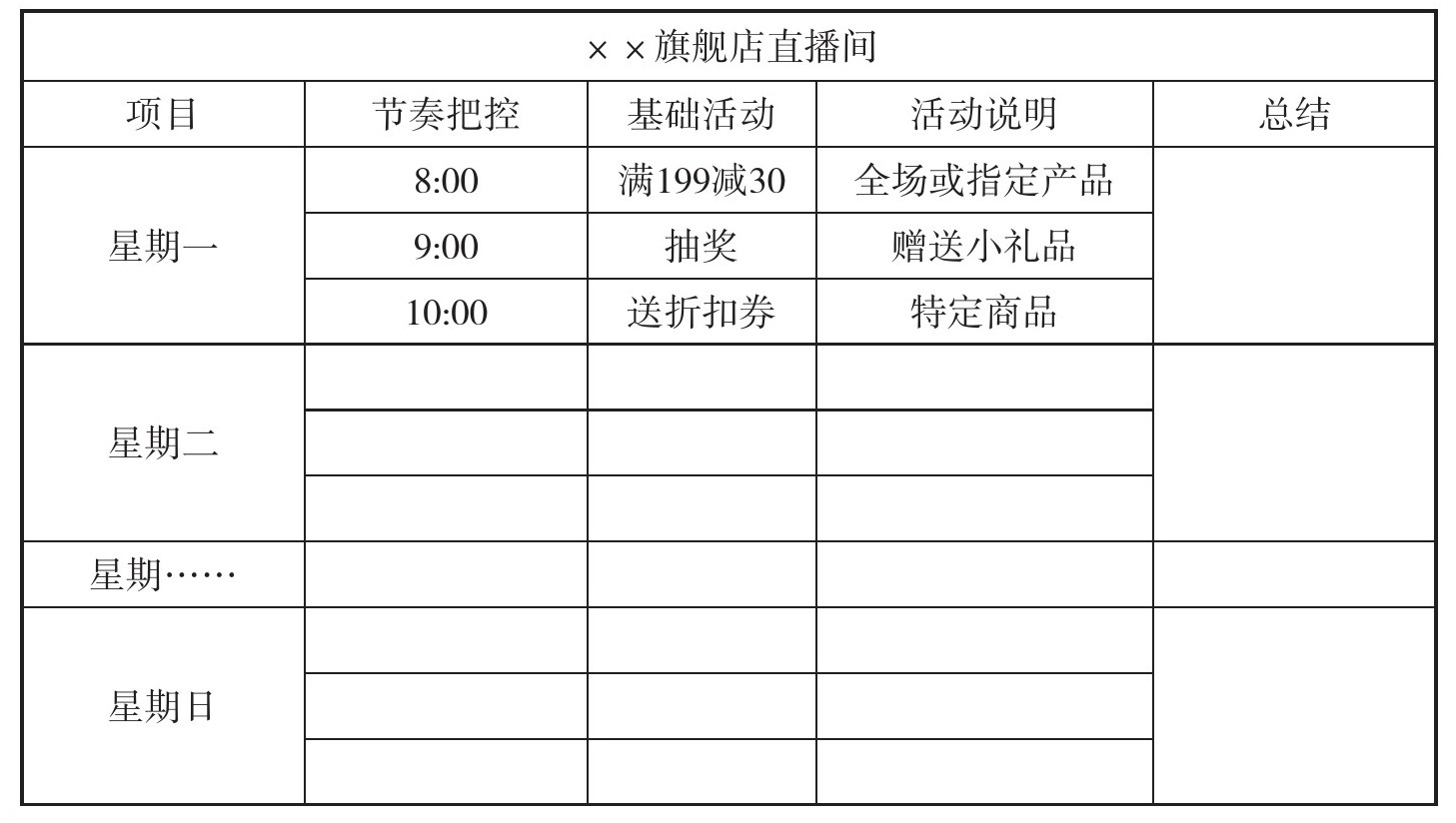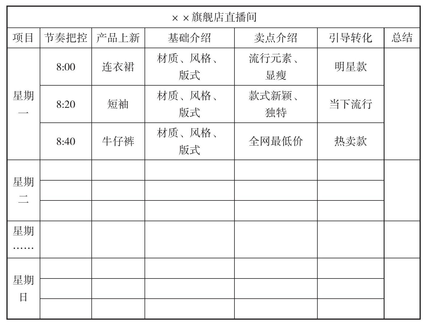 表6-1 一周上新脚本