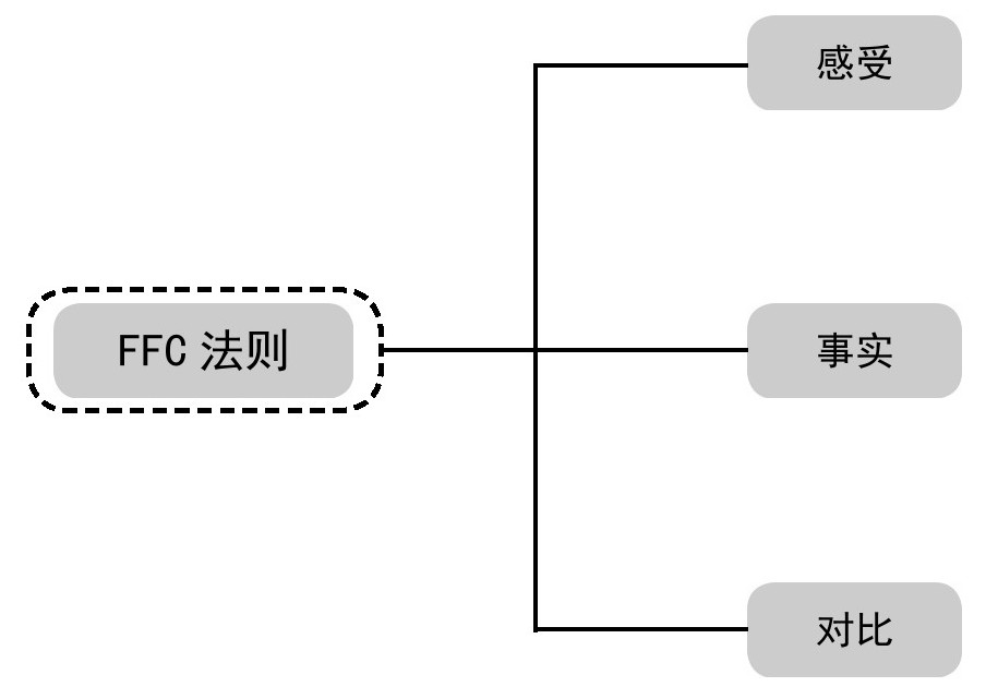 如下图所示,FFC法则包含3个元素:一是感受,二是事实,三是对比。这3个元素缺一不可。