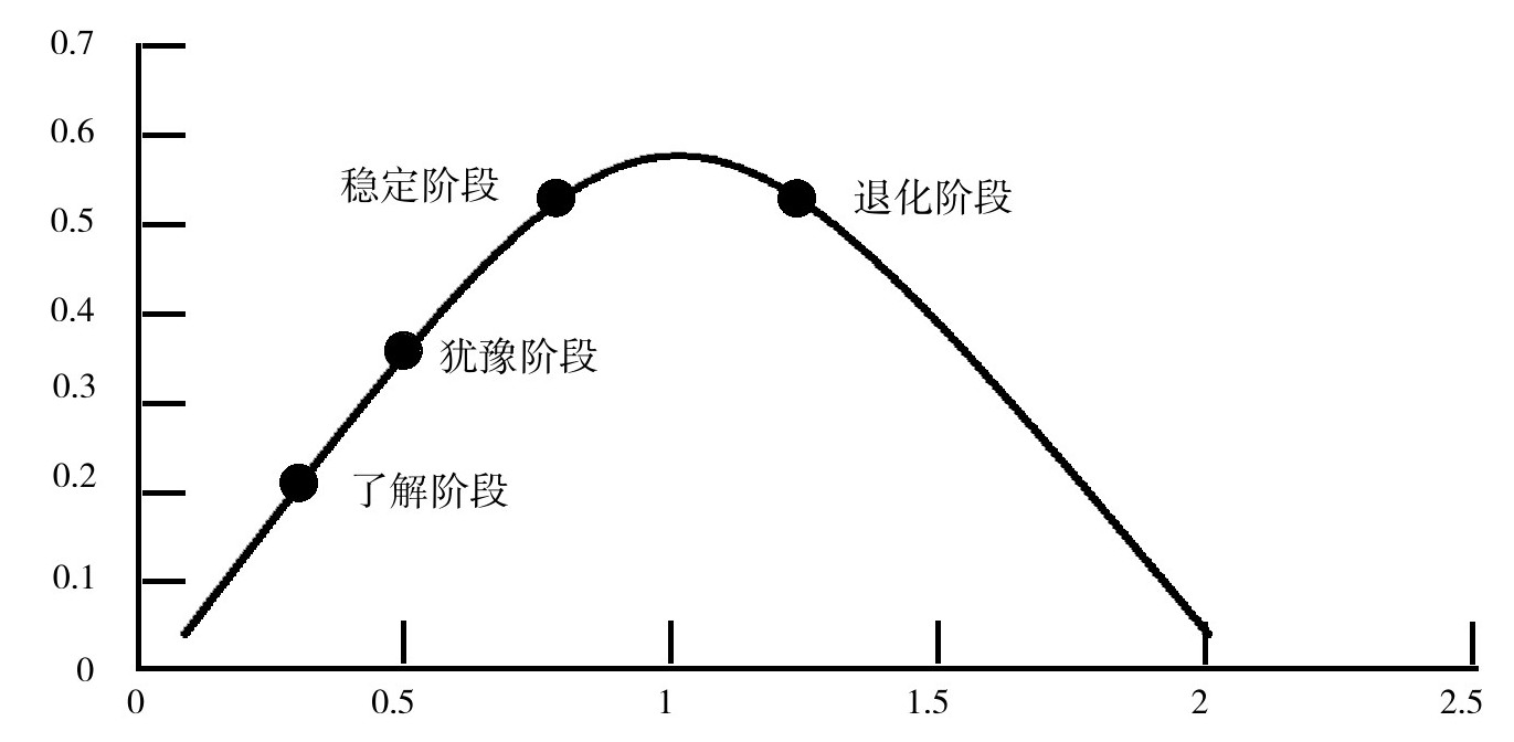 其实客户在购买的过程中,心理大致会经历四个阶段:了解阶段、犹豫阶段、稳定阶段、退化阶段。在整个阶段中,客户的购买欲望也会随之发生变化。如下图所示,客户的购买欲望起初会慢慢上升,到达稳定阶段后,如果销售员没有把握住时机,客户的购买欲望就会慢慢减退,销售员的销售机会也会随之溜走。